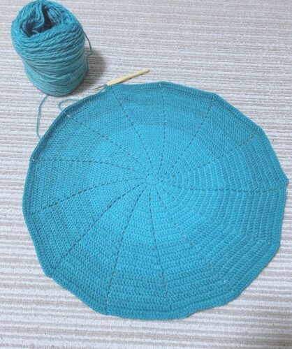 椅子に腰掛けてかけた時に足首がかかるかかからないかくらいの大きさまで編みました